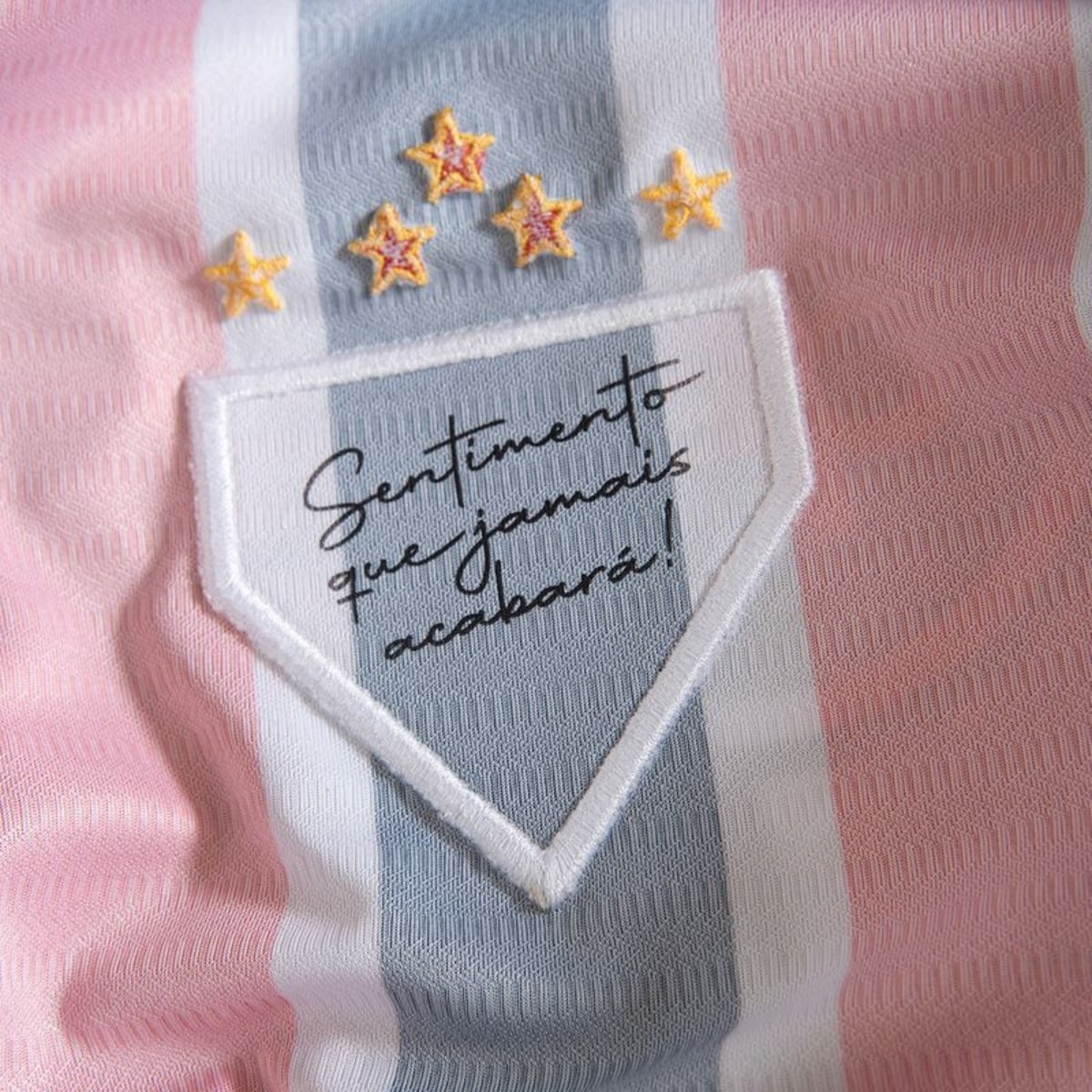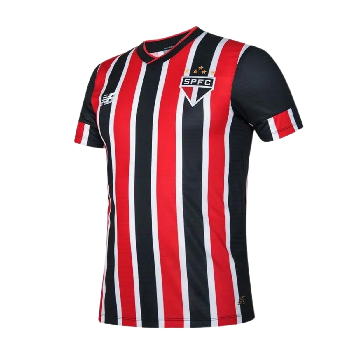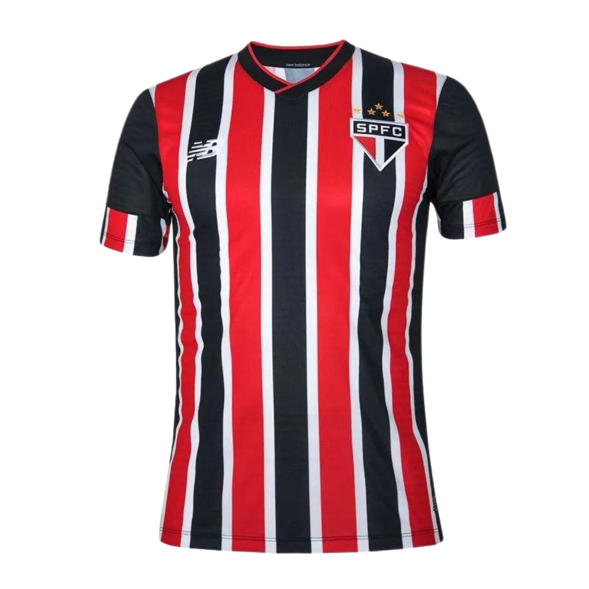 A Camisa do São Paulo 2024 AWAY Torcedor apresenta as clássicas listras verticais e gola V. Na parte de trás do modelo, exibe a marcante inscrição "A História Começa Aqui" e o selo "Made in Cotia: atletas e cidadãos", simbolizando os jovens talentos formados na base do clube.